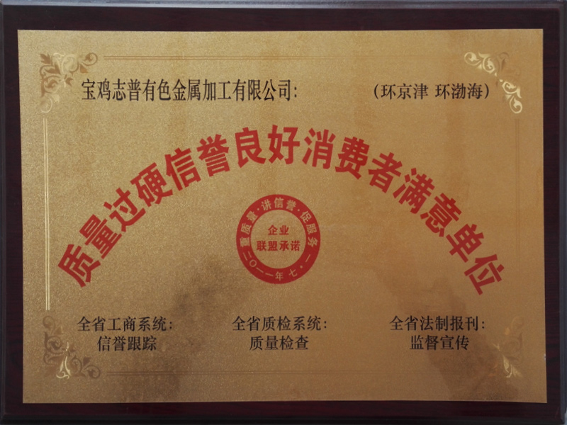 寶雞志普有色金屬加工有限公司被授予質(zhì)量過(guò)硬信譽(yù)良好消費(fèi)者滿意單位并頒發(fā)證書(shū)。